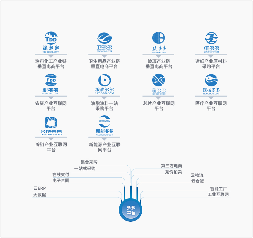 B2B垂直电商平台——涂多多(www.toodudu.com)、卫多多(www.wdoodoo.com)、玻多多(www.boododo.com)、纸多多(www.zdoodoo.com)、肥多多(www.feidoodoo.com)、粮油多多(www.lydodo.com)、芯多多(www.xdoodoo.com)、医械多多(www.yidoodoo.com)、冷链多多(www.lldoodoo.com)、新能多多(www.nedoodoo.com),为涂料化工、卫生用品、玻璃、造纸、化肥、粮油、芯片、医药器械、冷链、新能源等产业上下游提供网上商品交易业务...