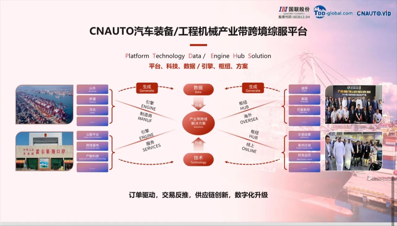 CNAUTO是国联股份旗下垂直汽车装备及工程机械产业带的跨境数字服务平台,以“产业跨境新通道+AI数字新基建”双轮驱动,提供一站式产业跨境解决方案。平台聚焦橡胶、轮胎、整车、工程机械等产业集群,依托国联“平台、科技、数据”战略,联动青岛、乌鲁木齐、重庆等自贸区及中东非、东南亚等海内外枢纽,打造“境内基地+海外中心+数字化服务”跨境生态。通过线上搭建AI大数据模型(退税、营销、合规等)、跨境新通道平台及产融科技平台,线下布局中东非海外仓和交易中心,实现全球分布式协同,推动产业带“抱团出海”,赋能中国制造全球化布局。
